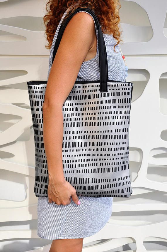 Leather tote bag, Vegan bag, Large everyday casual tote bag, Black shoulder bag, Silver handbag, Everyday bag, Grey handbag, Grey tote bag